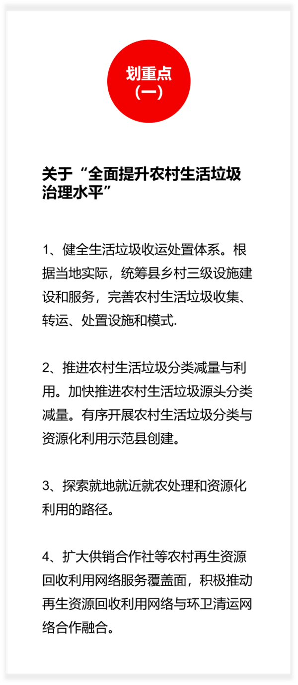 (十)推進農(nóng)村生活垃圾分類減量與利用。加快推進農(nóng)村生活垃圾源頭分類減量,積極探索符合農(nóng)村特點和農(nóng)民習(xí)慣、簡便易行的分類處理模式,減少垃圾出村處理量,有條件的地區(qū)基本實現(xiàn)農(nóng)村可回收垃圾資源化利用、易腐爛垃圾和煤渣灰土就地就近消納、有毒有害垃圾單獨收集貯存和處置、其他垃圾無害化處理。有序開展農(nóng)村生活垃圾分類與資源化利用示范縣創(chuàng)建。協(xié)同推進農(nóng)村有機生活垃圾、廁所糞污、農(nóng)業(yè)生產(chǎn)有機廢棄物資源化處理利用,以鄉(xiāng)鎮(zhèn)或行政村為單位建設(shè)一批區(qū)域農(nóng)村有機廢棄物綜合處置利用設(shè)施,探索就地就近就農(nóng)處理和資源化利用的路徑。擴大供銷合作社等農(nóng)村再生資源回收利用網(wǎng)絡(luò)服務(wù)覆蓋面,積極推動再生資源回收利用網(wǎng)絡(luò)與環(huán)衛(wèi)清運網(wǎng)絡(luò)合作融合。協(xié)同推進廢舊農(nóng)膜、農(nóng)藥肥料包裝廢棄物回收處理。積極探索農(nóng)村建筑垃圾等就地就近消納方式,鼓勵用于村內(nèi)道路、入戶路、景觀等建設(shè)。