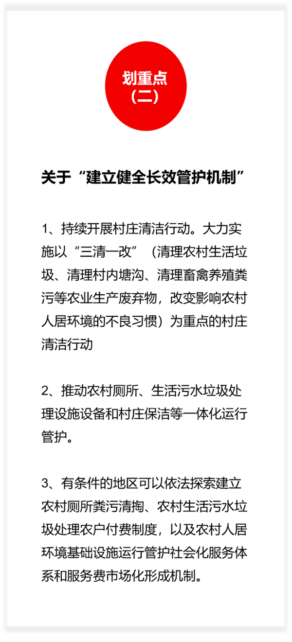 (十五)健全農(nóng)村人居環(huán)境長效管護機制。明確地方政府和職責(zé)部門、運行管理單位責(zé)任,基本建立有制度、有標(biāo)準(zhǔn)、有隊伍、有經(jīng)費、有監(jiān)督的村莊人居環(huán)境長效管護機制。利用好公益性崗位,合理設(shè)置農(nóng)村人居環(huán)境整治管護隊伍,優(yōu)先聘用符合條件的農(nóng)村低收入人員。明確農(nóng)村人居環(huán)境基礎(chǔ)設(shè)施產(chǎn)權(quán)歸屬,建立健全設(shè)施建設(shè)管護標(biāo)準(zhǔn)規(guī)范等制度,推動農(nóng)村廁所、生活污水垃圾處理設(shè)施設(shè)備和村莊保潔等一體化運行管護。有條件的地區(qū)可以依法探索建立農(nóng)村廁所糞污清掏、農(nóng)村生活污水垃圾處理農(nóng)戶付費制度,以及農(nóng)村人居環(huán)境基礎(chǔ)設(shè)施運行管護社會化服務(wù)體系和服務(wù)費市場化形成機制,逐步建立農(nóng)戶合理付費、村級組織統(tǒng)籌、政府適當(dāng)補助的運行管護經(jīng)費保障制度,合理確定農(nóng)戶付費分擔(dān)比例。