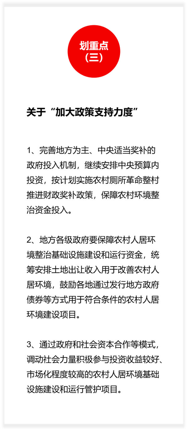 (十九)加強財政投入保障。完善地方為主、中央適當(dāng)獎補的政府投入機制,繼續(xù)安排中央預(yù)算內(nèi)投資,按計劃實施農(nóng)村廁所革命整村推進財政獎補政策,保障農(nóng)村環(huán)境整治資金投入。地方各級政府要保障農(nóng)村人居環(huán)境整治基礎(chǔ)設(shè)施建設(shè)和運行資金,統(tǒng)籌安排土地出讓收入用于改善農(nóng)村人居環(huán)境,鼓勵各地通過發(fā)行地方政府債券等方式用于符合條件的農(nóng)村人居環(huán)境建設(shè)項目。縣級可按規(guī)定統(tǒng)籌整合改善農(nóng)村人居環(huán)境相關(guān)資金和項目,逐村集中建設(shè)。通過政府和社會資本合作等模式,調(diào)動社會力量積極參與投資收益較好、市場化程度較高的農(nóng)村人居環(huán)境基礎(chǔ)設(shè)施建設(shè)和運行管護項目。